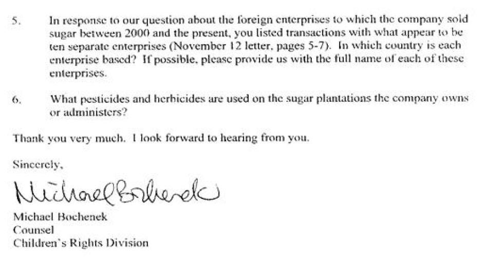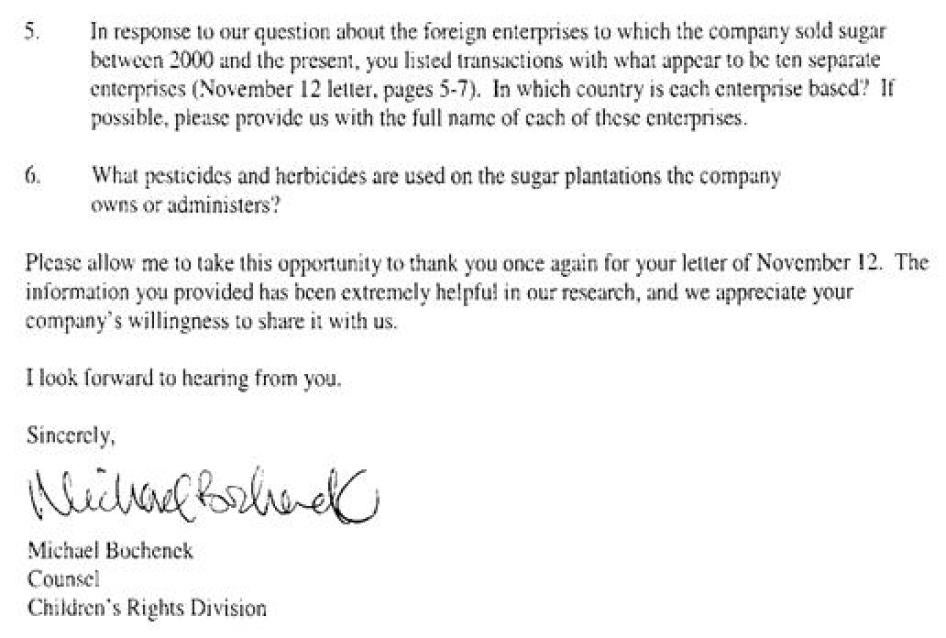 [230] See Letter from Juan Eduardo Interiano, general manager, Compaa Azucarera Salvadorea, S.A. de C.V., to Michael Bochenek, counsel, Children's Rights Division, Human Rights Watch, November 12, 2003, pp. 5-7.Human Rights Watch wrote to each of these multinational corporations to seek confirmation of this information.See Letter from Michael Bochenek, counsel, Children's Rights Division, Human Rights Watch, to Amerop Sugar Corp., March 22, 2004 (DHL Waybill No. 9148976734; received March 24, 2004, 10:22 a.m., by A. Oliva); Letter from Michael Bochenek, counsel, Children's Rights Division, Human Rights Watch, to Warren R. Staley, chairman and CEO, Cargill, Inc., March 22, 2004 (DHL Waybill No. 9148976756; received March 24, 2004, 8:38 a.m., by V. Koosman); Letter from Michael Bochenek, counsel, Children's Rights Division, Human Rights Watch, to Willy R. Strothotte, chairman, Glencore International AG, March 22, 2004 (DHL Waybill No. 7845587271; received March 24, 2004, 9:38 a.m. by Beeler); Letter from Michael Bochenek, counsel, Children's Rights Division, Human Rights Watch, to Peter B. Griffin, president, Louis Dreyfus Corp., March 22, 2004 (DHL Waybill No. 9148976745; received March 23, 2004, 10:07 a.m., by J. Edo); Letter from Michael Bochenek, counsel, Children's Rights Division, Human Rights Watch, to Tohru Tsuji, chairman, Marubeni Corp., March 22, 2004 (DHL Waybill No. 7845587260; received March 24, 2004, 4:58 p.m. by Kataoka).