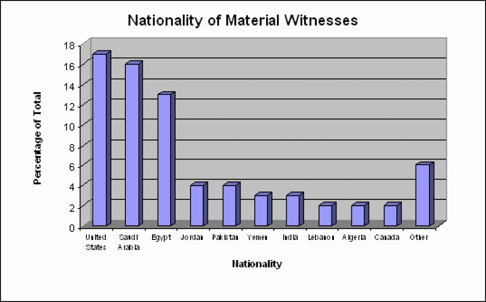 All of the seventy material witnesses HRW/ACLU identified in connection with this report were men. All but one was Muslim, by birth or conversion. All but two were of Middle Eastern, African, or South Asian descent, or African-American. Seventeen were U.S. citizens. The rest were nationals of Algeria, Canada, Djibouti, Egypt, France, India, Ivory Coast, Jordan, Lebanon, Pakistan, Palestine, Quatar, Saudi Arabia, Sudan, Syria, Yemen. (See below for a chart of the breakdown of these nationalities as a percentage of the total identified material witnesses.)