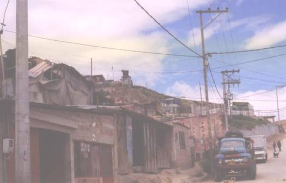 Displaced persons who come to the metropolitan region of Bogot typically end up in the city's poorer neighborhoods, places such as Bosa, Ciudad Bolvar, and Ciudad Kennedy; in and around the neighboring municipality of Soacha, particularly in makeshift housing on the hills known as the Altos de Cazuc; and in rural communities in the capital district, such as Usme.[54]In Cartagena, most displaced families settle in shantytowns in the Nelson Mandela, El Pozn, and Villa Hermosa communities, places that are, in the words of U.N. undersecretary for humanitarian affairs Jan Egeland, "floating in a sea of sewage and garbage."[55](Villa Hermosa is more commonly known as the Barrio Bill Clinton, a name its inhabitants adopted informally after President Clinton's visit to Cartagena in August 2000.)These communities tend to have a high level of violence, the result both of gang activity and the presence of one or more of the paramilitary and guerrilla groups.In Altos de Cazuc and Ciudad Bolvar in particular, local human rights groups report high homicide rates for youths under the age of twenty-five.[56]