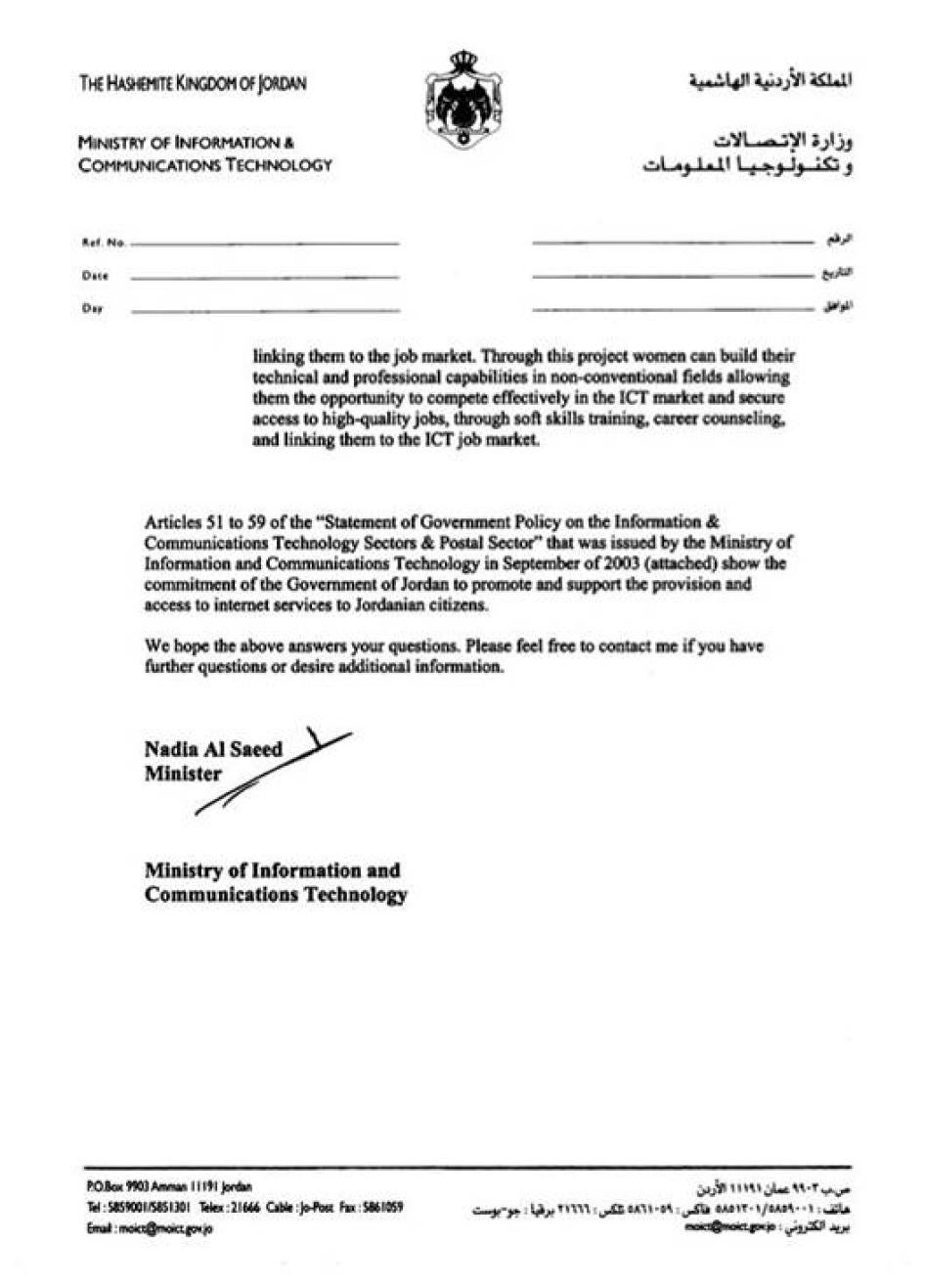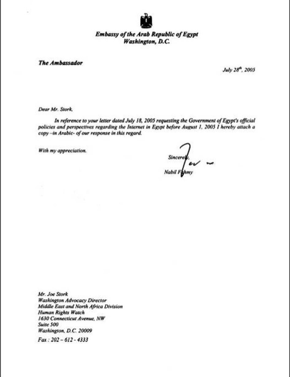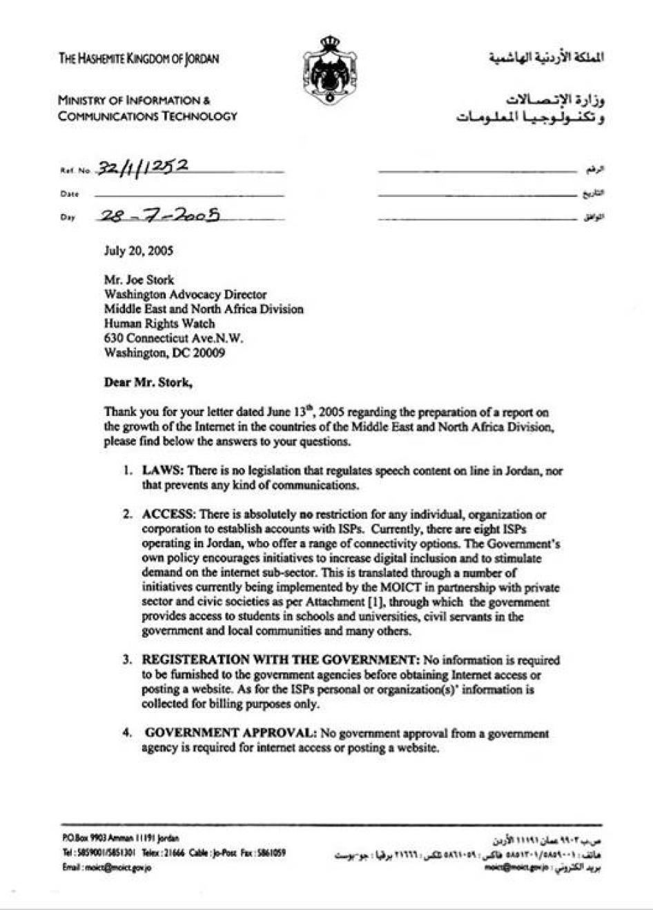 In preparing this current report, Human Rights Watch sent a similar letter (see Appendix A) to the governments of Bahrain, Egypt, Iran, Jordan, Saudi Arabia, Syria, Tunisia, and the United Arab Emirates. The governments of Egypt, Jordan, Syria, and Tunisia provided written responses, reproduced in Appendix B. The government of Iran directed Human Rights Watch to a Web site outlining some of its Internet policies. The government of Saudi Arabia acknowledged receipt of the letter but did not offer any further response. The governments of Bahrain and the United Arab Emirates did not reply.