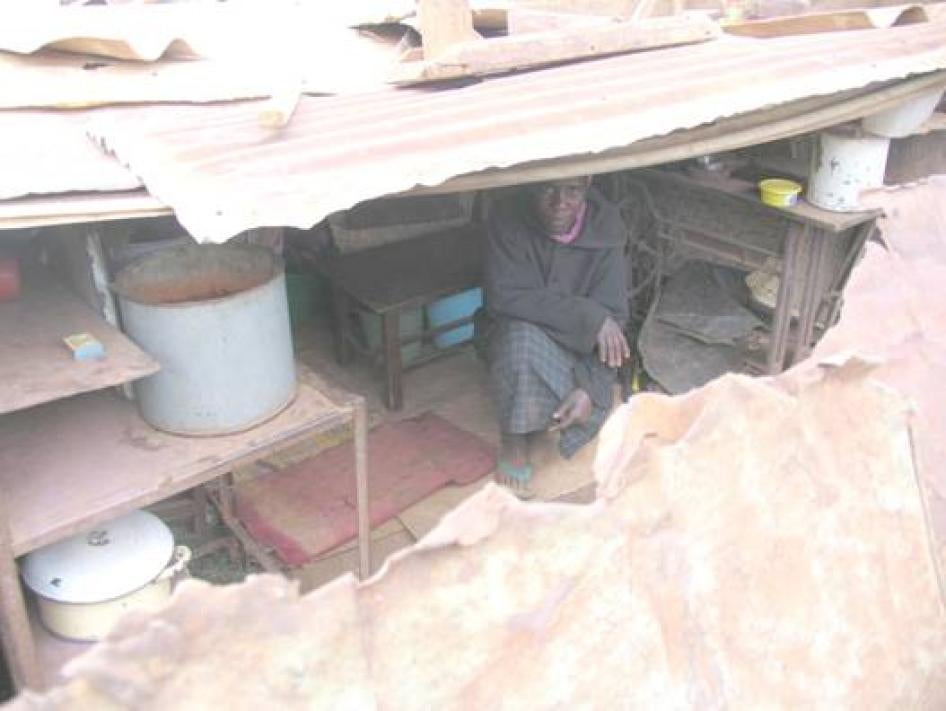 "Revai S." and her family had to assemble this shelter from pieces of metal and wood in Harare, after their brick house was destroyed during Operation Murabatsvina.