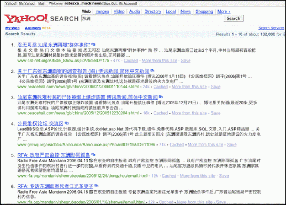 [91] Tests conducted by author between December 10 and 30, 2005, initially for the book chapter: Rebecca MacKinnon, "Flatter World and Thicker Walls? Blogs, Censorship and Civic Discourse in China" in Daniel Drezner and Henry Farrell, eds., The Political Promise of Blogging (Ann Arbor: University of Michigan Press, publication pending), draft version under the title "Chinese Blogs: Censorship and Civic Discourse" at