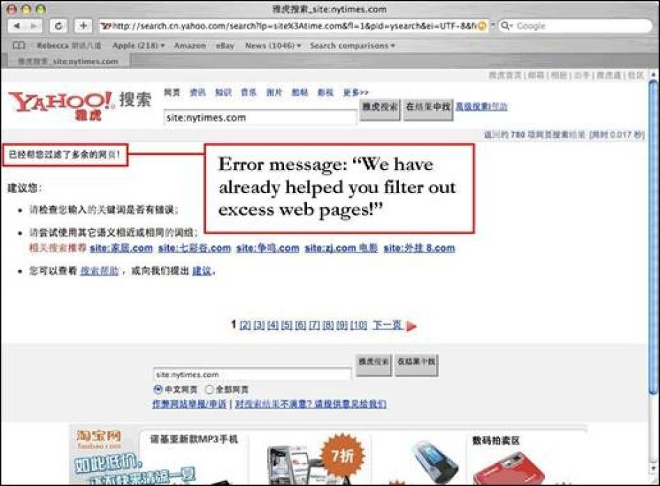 - Yahoo! China (cn.yahoo.com): Eight of the twenty-five websites tested yielded the actual website entered into the search box. Two yielded sub-domains but not the main domain. One was de-listed (producing no results for the website) with the message "extra results have been filtered." Fourteen were de-listed with a "no results found." (Interestingly, the same search using those fourteen keywords conducted on Yahoo! China from a non-Chinese ISP triggers a browser error. Technically, the reason why this happens is unclear.) On August 8, 2006, a spokesperson for Alibaba confirmed to Human Rights Watch that, since July 27, 2006, at the very bottom of every search results pageregardless of the search subjectYahoo! China now includes a small line of Chinese text saying: "In accordance with relevant laws and regulations, a portion of search results may not appear." (Also see Section IV, Fig. 5 for an example.)