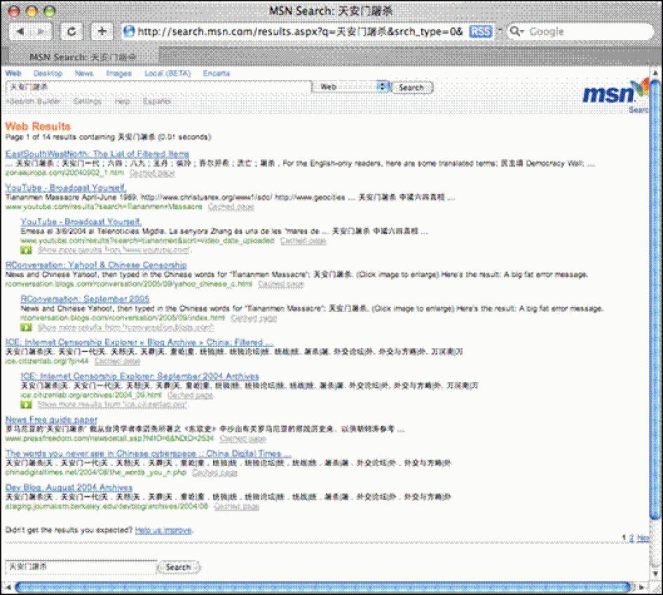 [105] The explanatory page is on MSN's Chinese search website at http://beta.search.msn.com.cn/docs/help.aspx?t=SEARCH_CONC_AboutSearchResults.htm&FORM=HRRE#4; For an example of a search result containing censorship notification see http://beta.search.msn.com.cn/results.aspx?q=高智晟&FORM=QBHP. For an example of a clearly censored search result without any block notification message see http://beta.search.msn.com.cn/results.aspx?q=天安门屠杀&FORM=QBHP (all retrieved July 12, 2006).