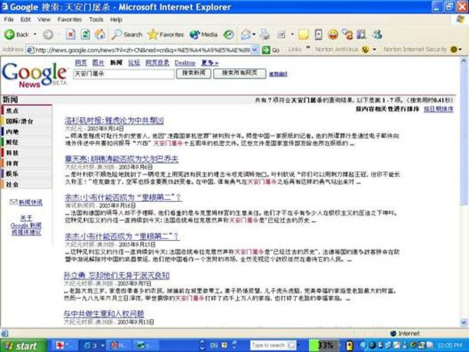 Yahoo!, Google, and Microsoft all argue that Chinese Internet users benefit from their presence, despite these companies' compromise with Chinese government censorship demands. However, this argument would require, among other things, that the services provided by these companies to Chinese users enable greater access to information than they would be able to receive from their domestic Chinese competitors. A comparison by Human Rights Watch of the three companies' search engines with Baidu, China's most popular domestic search engine, indicates that while Google.cn and Microsoft's new "beta" Chinese search engine provide significantly better access to information than Baidu, our experience with Yahoo!'s Chinese search results indicates no better access to information than Baidu.[53] We conducted tests on various dates between May and August 2006; results varied, at times even on the same day.
