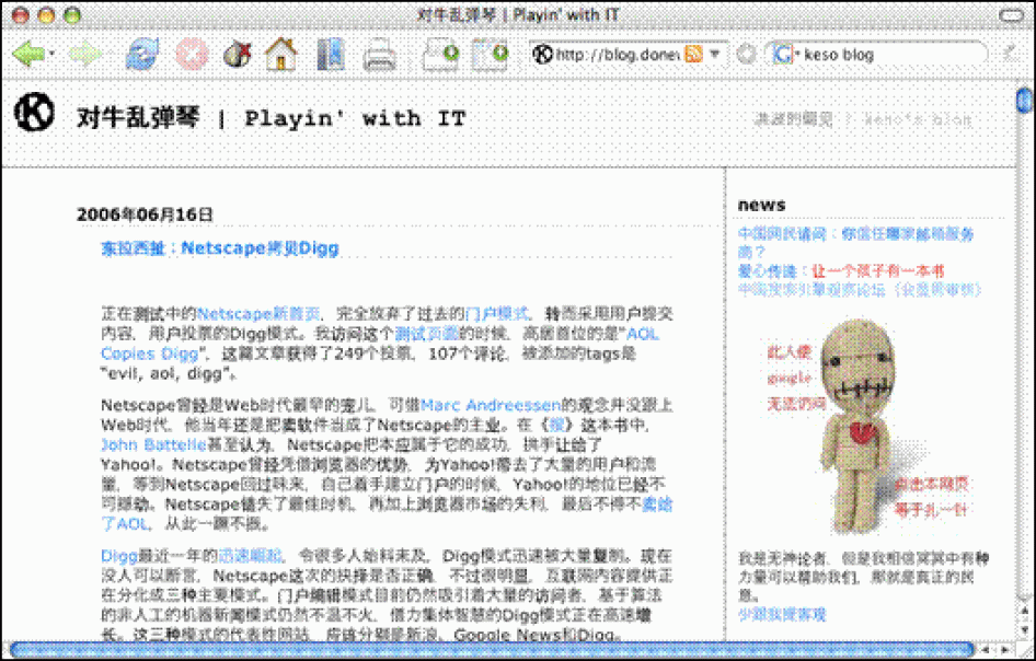 [144] Keso, "Google de zhongguo nanti," blog, Playin' with IT, June 9, 2006, http://blog.donews.com/keso/archive/2006/06/09/909077.aspx (retrieved July 12, 2006).