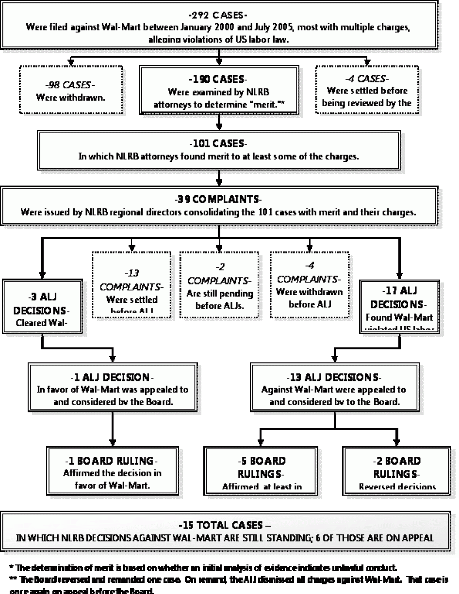 Through Freedom of Information Act (FOIA) requests to the NLRB's thirty-two regional offices, Human Rights Watch also obtained hundreds of pages of documents related to the 292 cases alleging unfair labor practice charges filed against Wal-Mart between 2000 and mid-2005. We reviewed these documents, as well as the decisions in cases that came before NLRB administrative law judges (ALJs) and the five-member Board in Washington, DC.We believe that this is the most comprehensive attempt by an independent organization to date to obtain and analyze NLRB cases against Wal-Mart.
