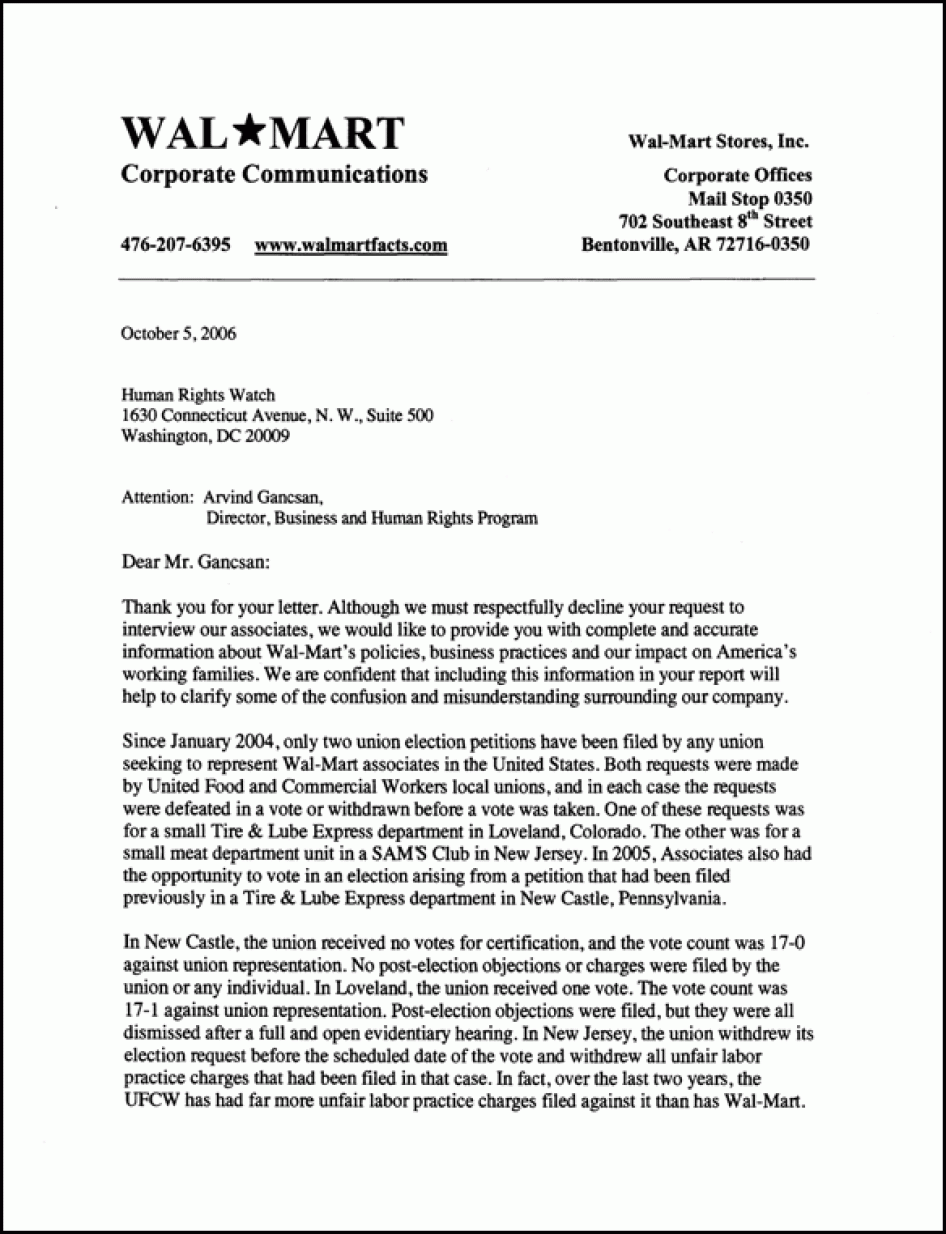 Human Rights Watch sent a third letter to Scott on September 27, 2006, requesting "a meeting with members of Wal-Mart's Labor Relations Team and other members of Wal-Mart management."On October 5, Human Rights Watch received a response from David Tovar, Wal-Mart's director of media relations, that said, "[W]e must respectfully decline your request to interview our associates."[27]
