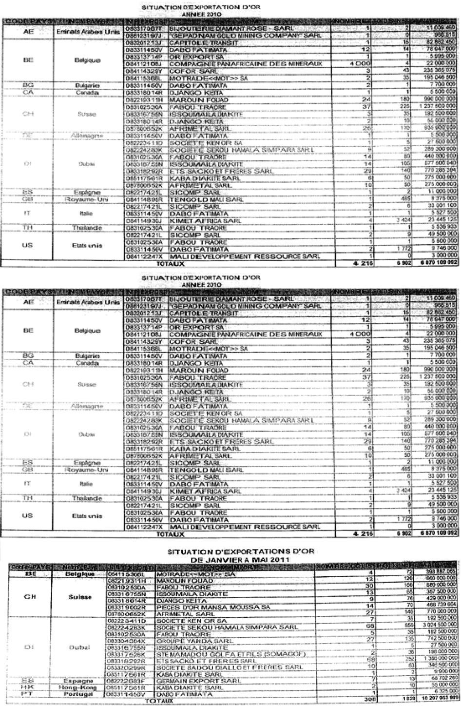 [367] See Annex I, Ministère de l’Economie et des Finances, “Tableaux statistiques des exportations d’or des mines artisanales au titre des années 2009, 2010 et 2011,” Bamako, July 19, 2011.