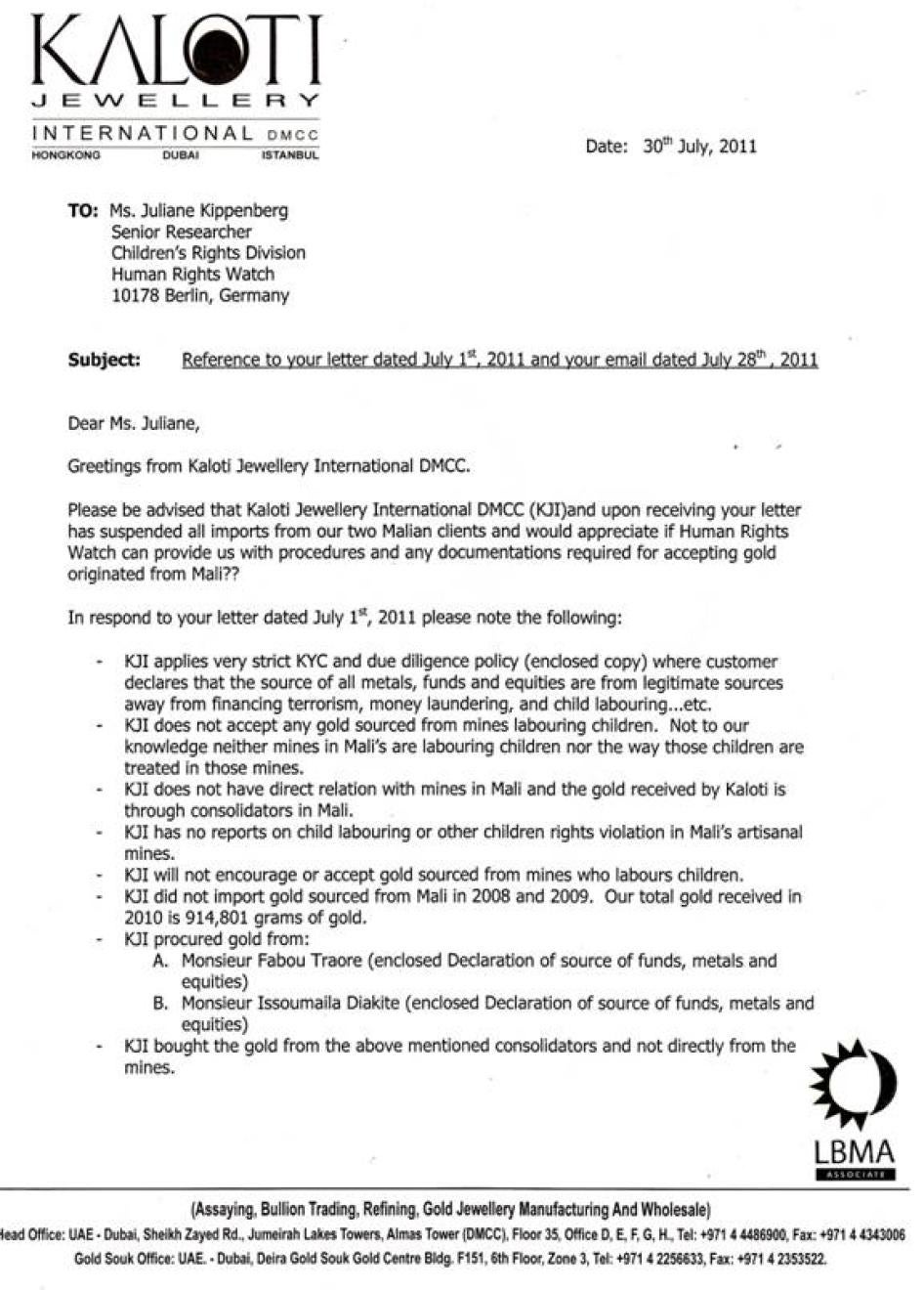 [377] Letter from Tareq El-Mdaka, Managing Director, Kaloti Jewellery International DMCC, to Human Rights Watch, July 30, 2011.