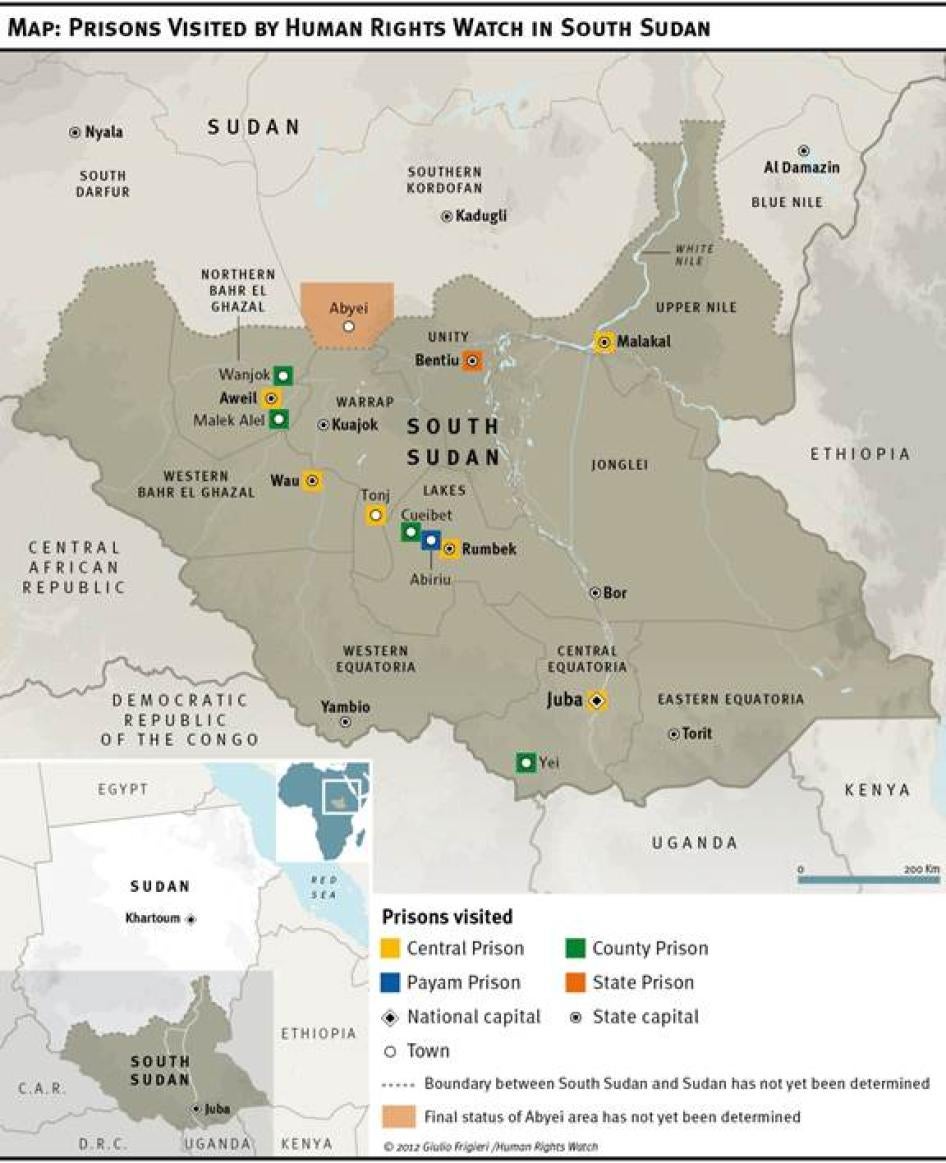 This report is based on research conducted between March 2011 and January 2012. Researchers visited 12 of South Sudan’s approximately 79 prisons, in seven of South Sudan’s 10 states: Juba and Yei prisons in Central Equatoria state; Rumbek, Cueibet and Abiriu prisons in Lakes state; Malakal prison in Upper Nile state; Wau prison in Western Bahr el Ghazal state; Aweil, Wanjok and Malek Alel prisons in Northern Bahr el Ghazal state; Tonj prison in Warrap state; and Bentiu prison in Unity state. The director general of South Sudan Prisons Service granted Human Rights Watch researchers unfettered access to the prisons.