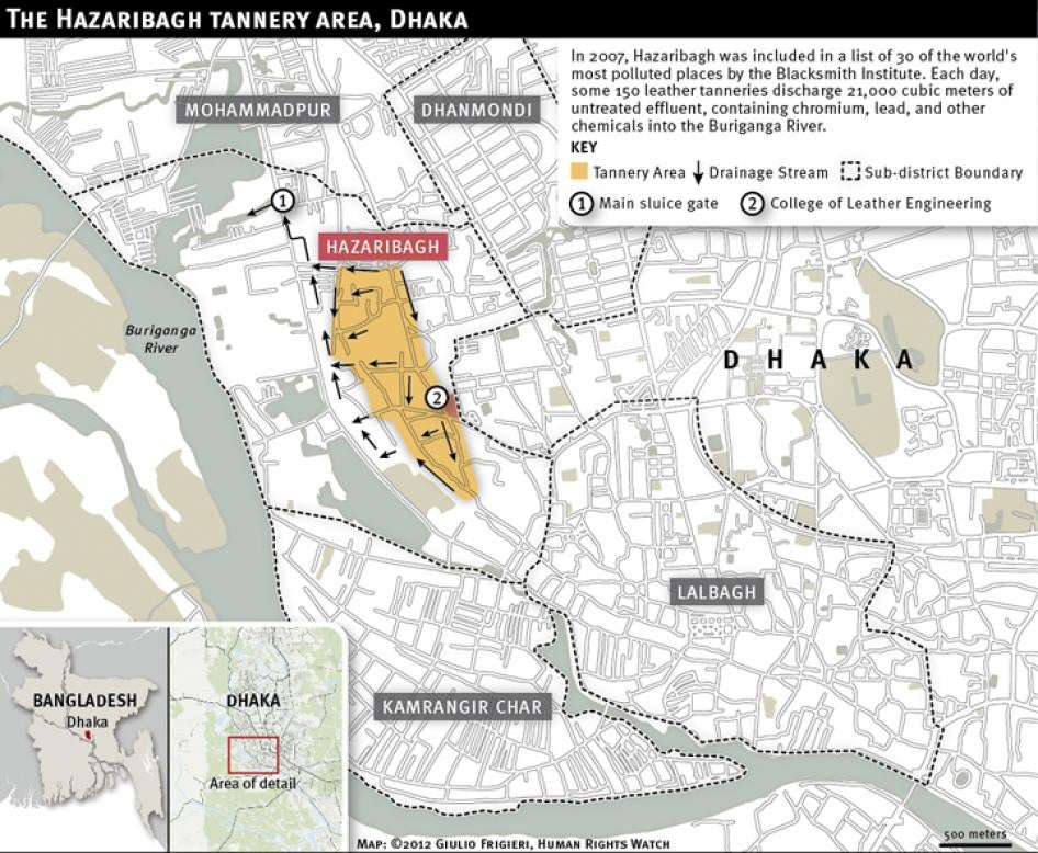 [200] Human Rights Watch interviews with Md. Mustafizur Rahman, factory inspector, Department of Inspection for Factories and Establishments, Ministry of Labour and Employment, Dhaka, June 13, 2012; Sheikh Fazle Noor Taposh, member of parliament for Hazaribagh, Dhaka, June 10, 2012; Mahbubur Rahman, general manager, Bangladesh Small & Cottage Industries Corporation (BSCIC), Ministry of Industries, Dhaka, June 6, 2012; Md Abu Sadeque, director, Bangladesh Small & Cottage Industries Corporation (BSCIC), Ministry of Industries, Dhaka, June 13, 2012; Mahmood Hasan Khan, director of air quality management, Department of Environment of the Ministry of Environment and Forests, Dhaka, June 7, 2012; Md. Abul Monsur, director of Dhaka region, Department of Environment of the Ministry of Environment and Forests, Dhaka, June 11, 2012; Quazi Sarwar Imtiaz Hashmi, director of metropolitan Dhaka, Department of Environment of the Ministry of Environment and Forests, Dhaka, June 11, 2012.