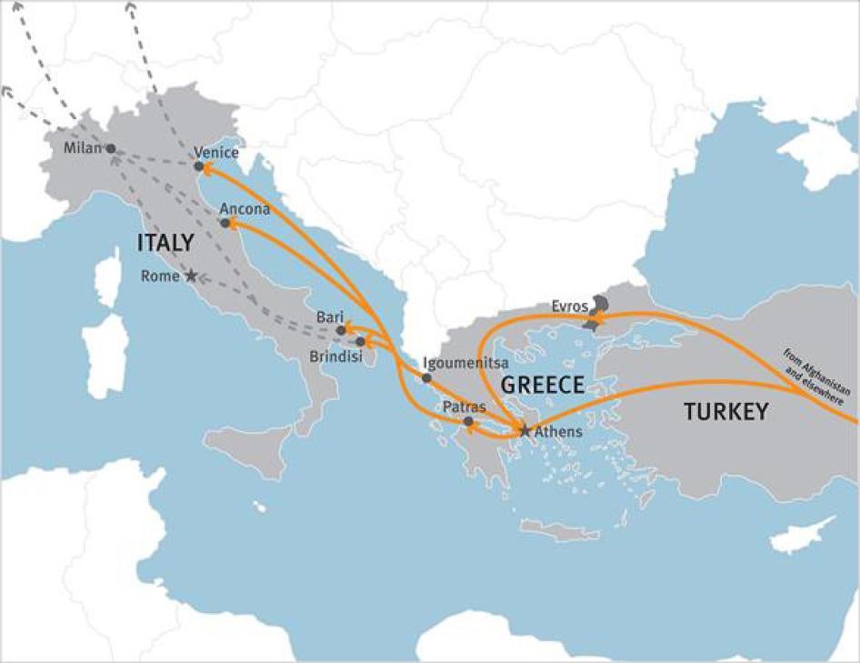 Human Rights Watch research suggests that the ultimate goal for many, whether they are economic migrants or asylum seekers, is to transit through Greece and Italy to other countries in the European Union. Hundreds of foreigners congregate in the Greek port cities Patras and Igoumenitsa looking for a chance to stow away on daily ferries bound for the Italian ports of Ancona, Bari, Brindisi, and Venice. As this report documents, many face summary return to Greece if detected upon arrival.