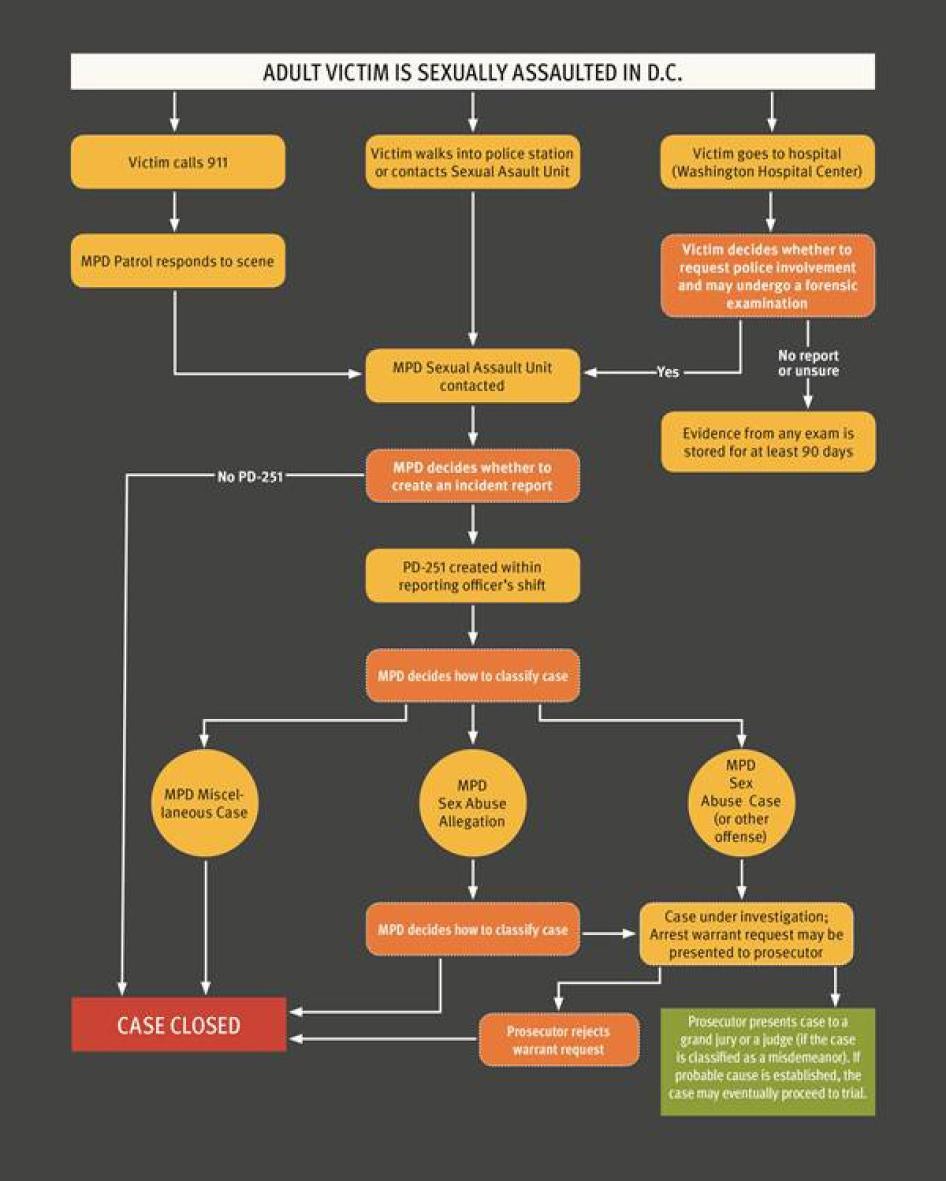 As part of its investigation, Human Rights Watch conducted over 150 interviews and reviewed numerous documents produced by the MPD and other government agencies. These include the Office of Victim Services (OVS) in the Mayor’s Office, which oversees the program for sexual assault victims at Washington Hospital Center (WHC)—the designated hospital for care of adult sexual assault victims in the District.