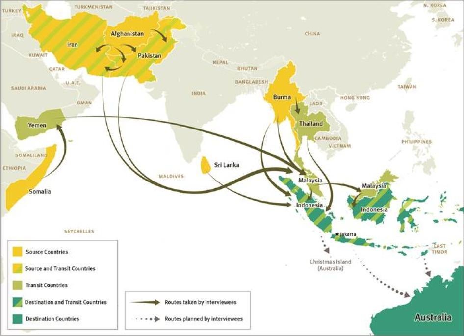 For tens of thousands of migrants and asylum seekers—most from East Africa and South and Southeast Asia—Indonesia is an intended way station along a difficult and dangerous journey to Australia, where migrants hope to find opportunities for a better life and, often, protection from violence and persecution in home countries. Yet most stay in limbo in Indonesia for months or years. As of February 2013, most refugees and asylum seekers in Indonesia came from Afghanistan, Burma, Sri Lanka, and Iran.[6] Thousands of children travel this route annually—some with their families and others alone.[7]