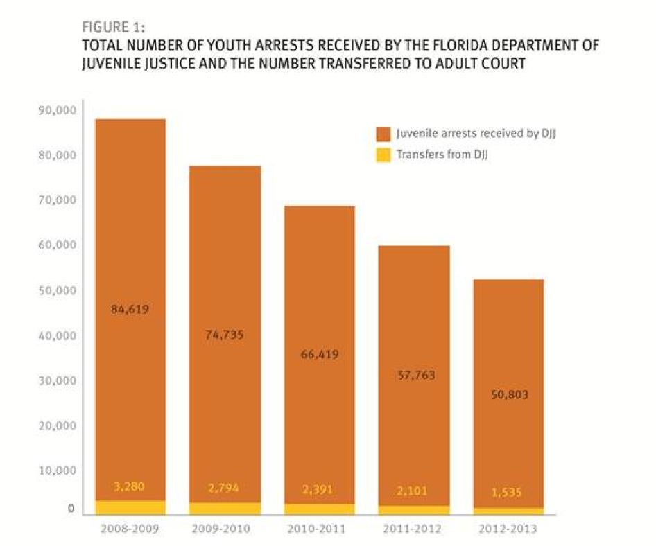 Florida transfers more children out of the juvenile system and into adult court than any other state. In the last five years alone, more than 12,000 juvenile crime suspects in Florida were transferred to the adult court system. New statistics developed by Human Rights Watch based on official Florida state data show that more than 60 percent of the juveniles Florida transferred to adult court during this period were charged with nonviolent felonies. Only 2.7 percent were prosecuted for murder.