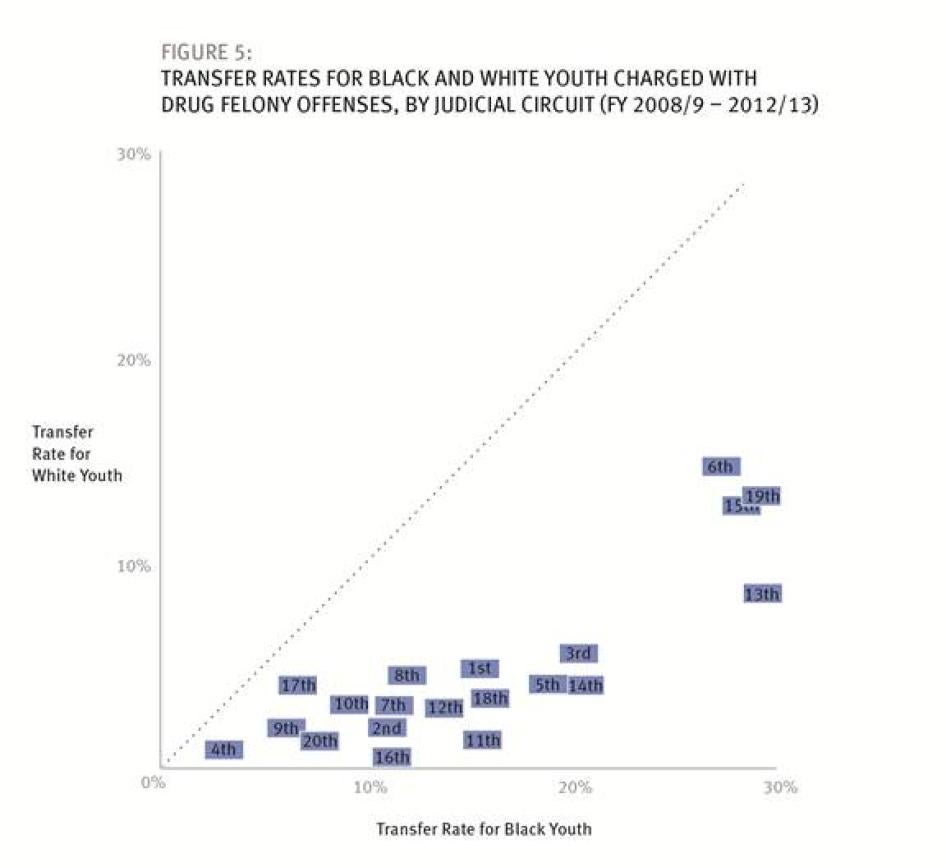 Statewide, Florida is also treating its black male youth more harshly than their white counterparts. Black boys make up 27.2 percent of children arrested for crime, but account for 51.4 percent of youth sent to adult court; whereas white boys make up 28 percent of children arrested and account for only 24.4 percent of youth tried in adult court. A simple explanation might be that the crimes of black boys are more serious than those of white boys; Human Rights Watch looked into transfer rates for different categories of crime in an effort to find out. While for some crimes the transfer rates are similar, for others there is a marked disparity, particularly in certain judicial circuits. The 13th Circuit, for example, transferred 8.8 percent of white youths arrested for drug felonies to adult court; for black youth arrested for the same crimes, that figure was 30.1 percent, more than three times higher. The available data do not include important details of the cases that may partly account for the disparities, including the drug quantities involved and the criminal histories of the offenders, but the consistency and size of the racial disparities nonetheless are of serious concern.