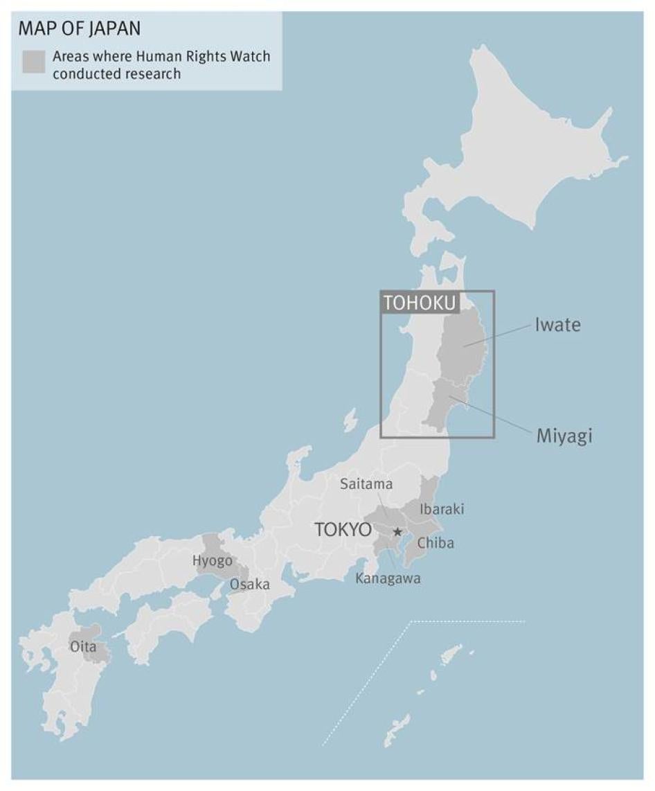 Out of the 202 interviewees, 61 are from the Tohoku region. Human Rights Watch visited Tohoku four times, in December 2011, and in May, June, and August of 2012. We visited cities and towns devastated by the 2011 earthquake and interviewed earthquake orphans, care givers taking care of the orphans, local government officials, and representatives of civil society organizations.