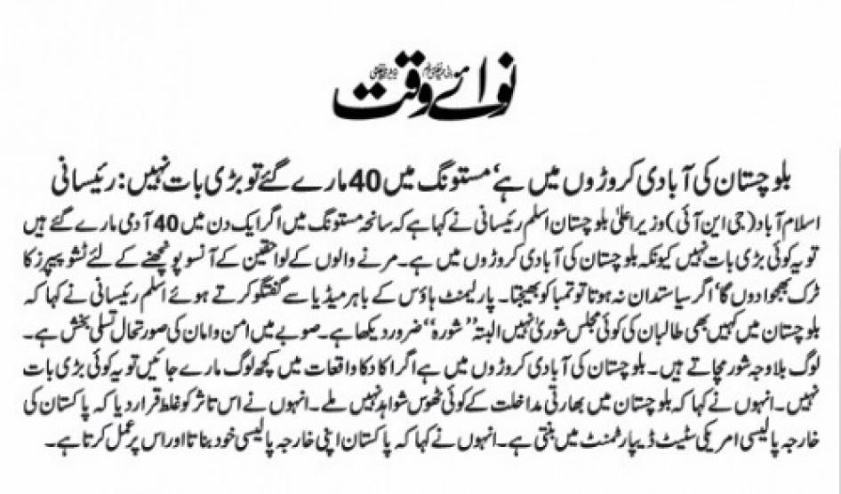 [176] Javeria Nasir, “Two killed in Quetta firing,” AAJ News, April 21, 2012, http://www.aaj.tv/2012/04/two-killed-in-quetta-firing/ (accessed June 2, 2014).