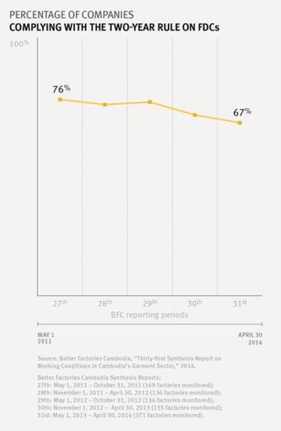 Contrary to claims by the Garment Manufacturers Association of Cambodia (GMAC) that factories using repeated short-term contracts are “black sheep,” BFC reported that the number of surveyed factories complying with the two-year rule on short-term contracts (called fixed-duration contracts or FDCs in Cambodia) dropped from 76 percent in 2011 to 67 percent in 2013-2014. Since 2011, BFC has consistently found that nearly a third of all factories used FDCs to avoid paying maternity and seniority benefits.