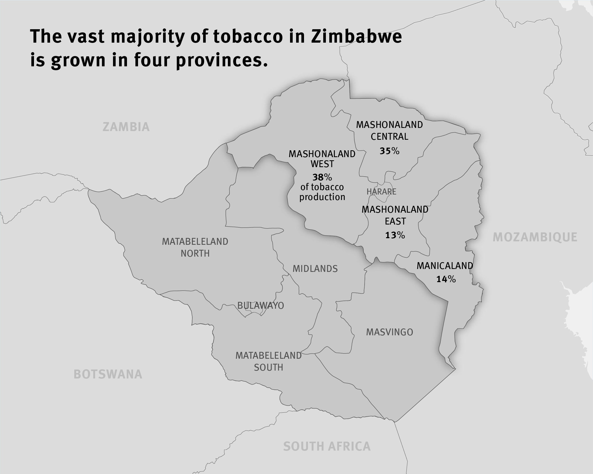 The controversial “fast track” land reform program introduced in 2000 by the ruling party—the Zimbabwe African National Union-Patriotic Front (ZANU-PF)—has radically altered the nature of tobacco production in Zimbabwe. Under the program, the government seized thousands of large-scale commercial farms owned by white farmers and redistributed plots of land, including many that were given to landless black Zimbabweans. Since the start of the fast track land reform process, the number of active tobacco growers in Zimbabwe increased dramatically, from around 8,500 growers in 2000, to more than 73,000 in 2016, at least in part due to the government subdividing and redistributing some large farms. Zimbabwe’s Tobacco Industry and Marketing Board (TIMB) reports that 99 percent of tobacco is grown in one of four provinces: Mashonaland West, Mashonaland Central, Mashonaland East, and Manicaland.