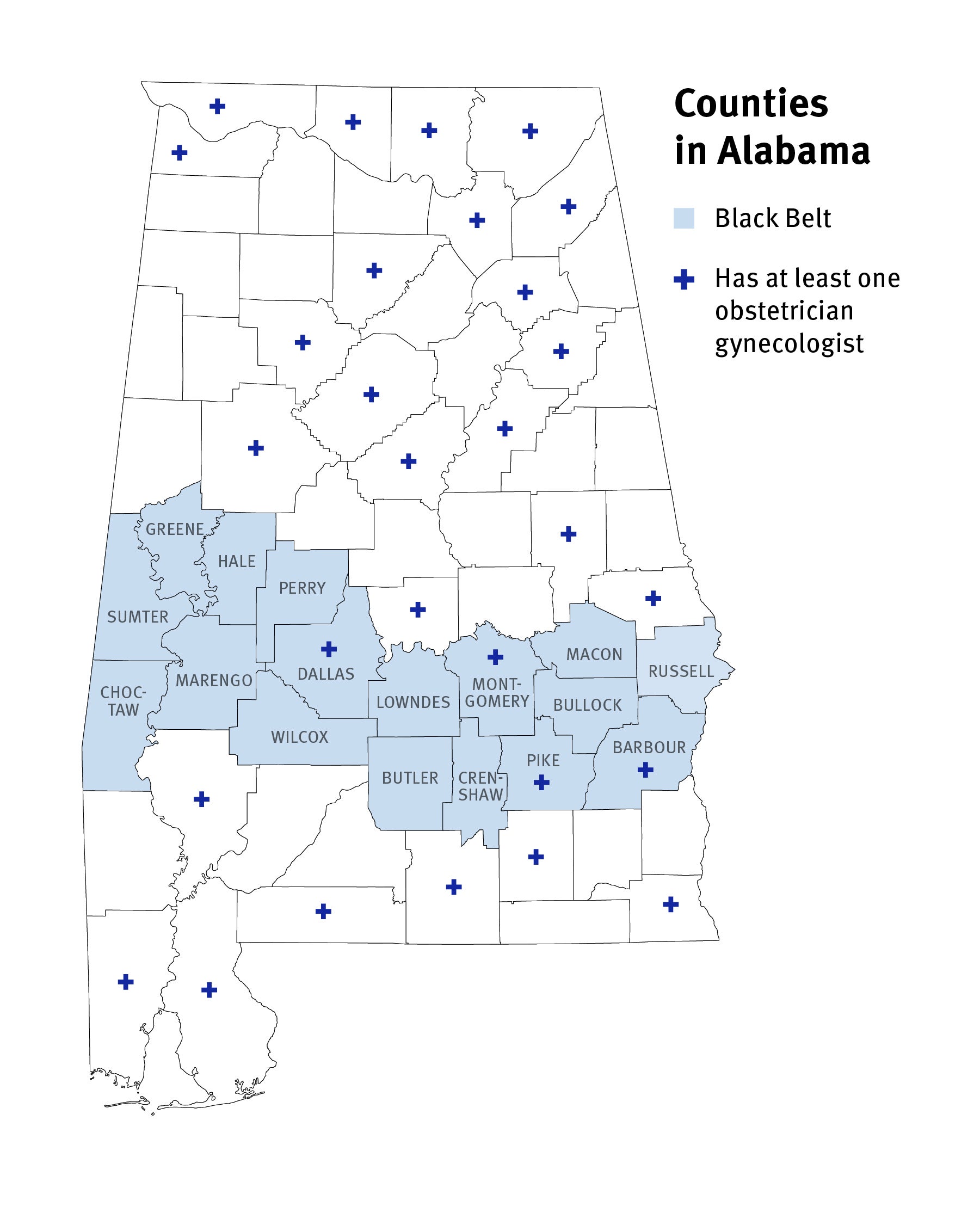 There are multiple definitions of which counties constitute the Alabama Black Belt region. Unless otherwise noted, this report relies on the traditional definition of the 17 counties stretching across central Alabama: Barbour, Bullock, Butler, Choctaw, Crenshaw, Dallas, Greene, Hale, Lowndes, Macon, Marengo, Montgomery, Perry, Pike, Russell, Sumter, and Wilcox.