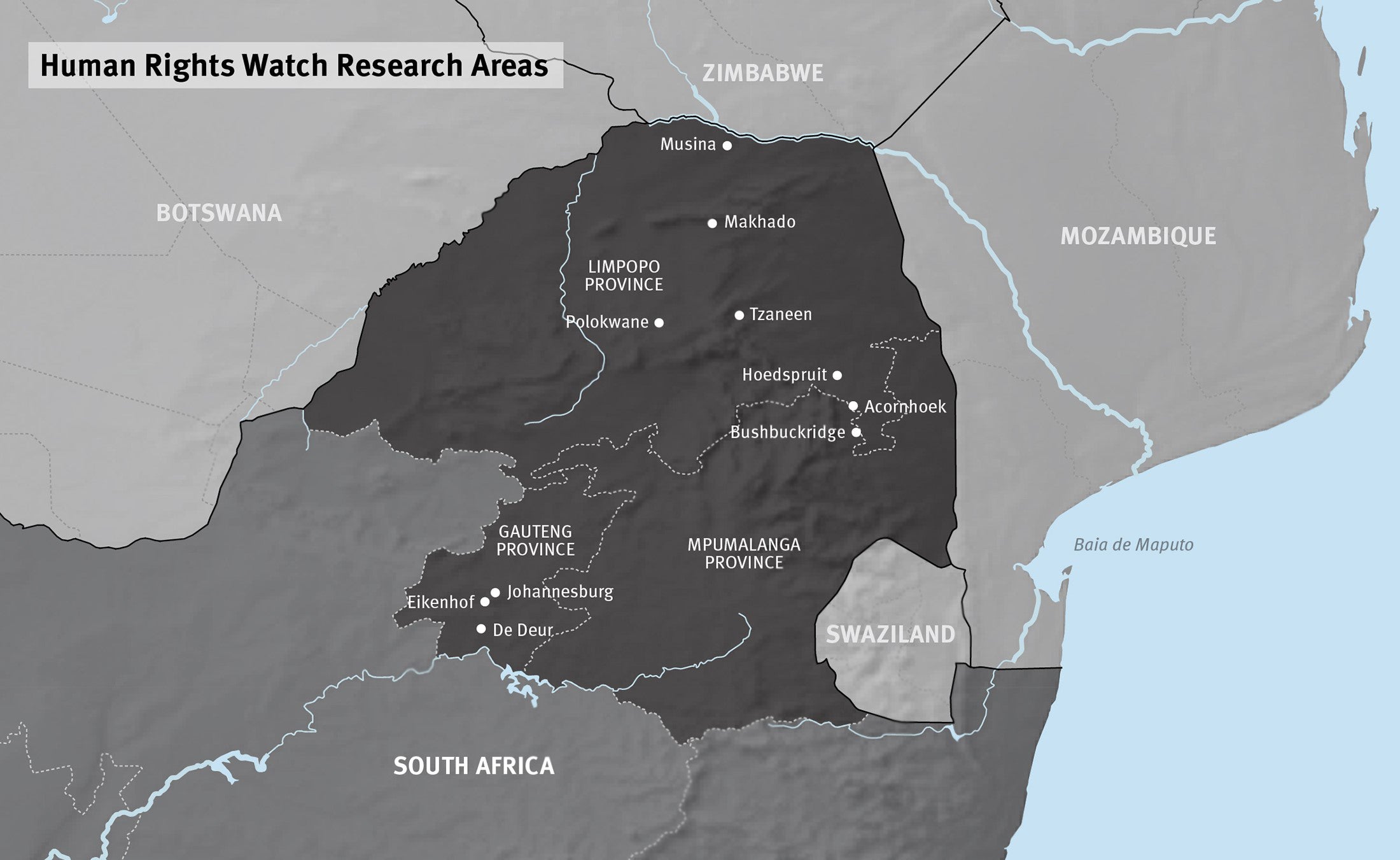 This report is based on research conducted by a Human Rights Watch researcher in the cities of Johannesburg, Gauteng province, and Cape Town, Western Cape province; Masina, Makhado, Tzaneen, Hoedspruit towns, all Limpopo province; Bushbuckridge town, Mpumalanga province; and De Deur and Eikenhof towns, Gauteng province. The research took place in April, May, and June 2018, during two trips to South Africa.