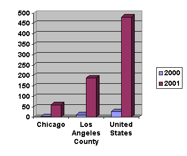 87 Anti-Muslim hate crimes in the United States increased from twenty-eight during 2000 to 481 during 2001. See "Crime in the United States - 2001," Federal Bureau of Investigation, retrieved on October 30, 2002, from http://www.fbi.gov/ucr/01cius.htm. Anti-Arab and anti-Muslim hate crimes in Los Angeles County increased from twelve during 2000 to 188 during 2001. See "Compounding Tragedy: The Other Victims of September 11," Los Angeles County Commission on Human Relations, p. 12 and 14, retrieved on September 24, 2002, from http://humanrelations.co.la.ca.us/Our_publications/pdf/2001HCR.pdf. Anti-Arab and anti-Muslim hate crimes in Chicago increased from four during 2000 to sixty during 2001. See "Hate Crimes in Chicago: 2001," Chicago Police Department, p. 13, retrieved on September 24, 2002, from http://www.ci.chi.il.us/CommunityPolicing/Statistics/Reports/HateCrimes/HateCrimes01.pdf.