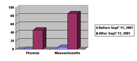 88 During 2001, Massachusetts had five anti-Arab or anti-Muslim hate crimes before September 11 and eighty-six after. See Marie Szaniszlo, "Study: 9/11 fuels anti-Arab crime," Boston Herald, September 25, 2002. During 2001, Phoenix had no anti-Arab or anti-Muslim hate crimes before September 11 and forty-six after. See "Bias Incident Statistics," Phoenix Police Department, retrieved on October 29, 2002, from http://www.ci.phoenix.az.us/POLICE/hatecr2.html.