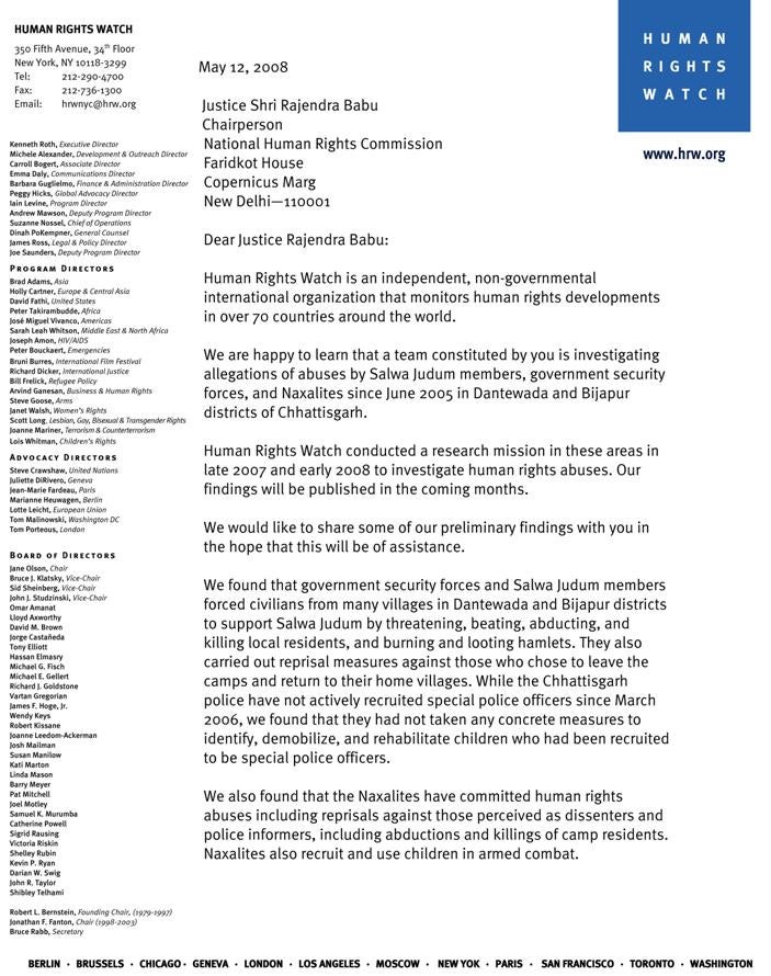 * * * April 28, 2008 Shri Raman Singh Dear Chief Minister Singh: Human Rights Watch is an independent, non-governmental international organization that monitors human rights developments in over 70 countries around the world. We conducted an investigation into human rights issues in Dantewada and Bijapur districts of Chhattisgarh from November 2007 through February 2008. We are extremely concerned about the suffering of ordinary civilians who are caught in the middle of the conflict between Naxals and the Salwa Judum and government security forces. We found that all parties have been responsible for serious human rights abuses. However, abuses by the Naxals do not justify abuses, including killings, beatings, abductions, arbitrary detentions, and looting and burning of villages, by Salwa Judum members with the support of the security forces. We will be issuing a report in mid-2008 based on information collected during the research mission. Before we issue this report, we are keen to incorporate your governments views on how these problems can be addressed. In particular, we would like to include your views on the development, impact, and outcomes of Salwa Judumspecifically, your responses to the questions annexed to this letter. We appreciate your responding to our questions, which if received by May 15, 2008, will be taken into consideration in the preparation of our report. Responses may be emailed (beckerj@hrw.org) or faxed (+1-212-736-1300) to us. We also stand ready to engage in dialogue with you about important human rights concerns in Dantewada and Bijapur, and possible solutions to the problems faced by tribal communities in the region. Sincerely, Jo Becker List of questions for your response: