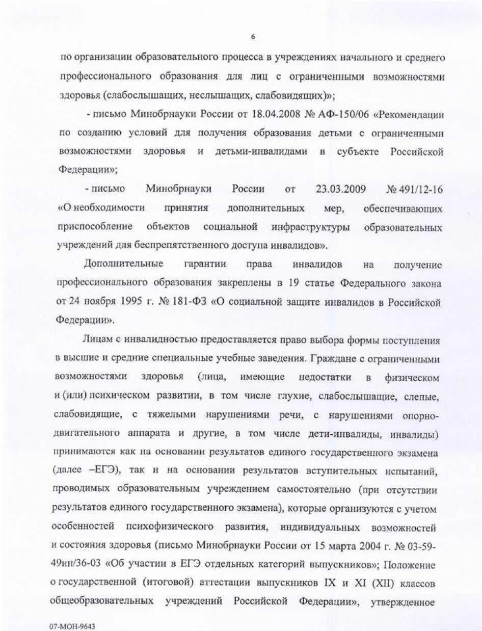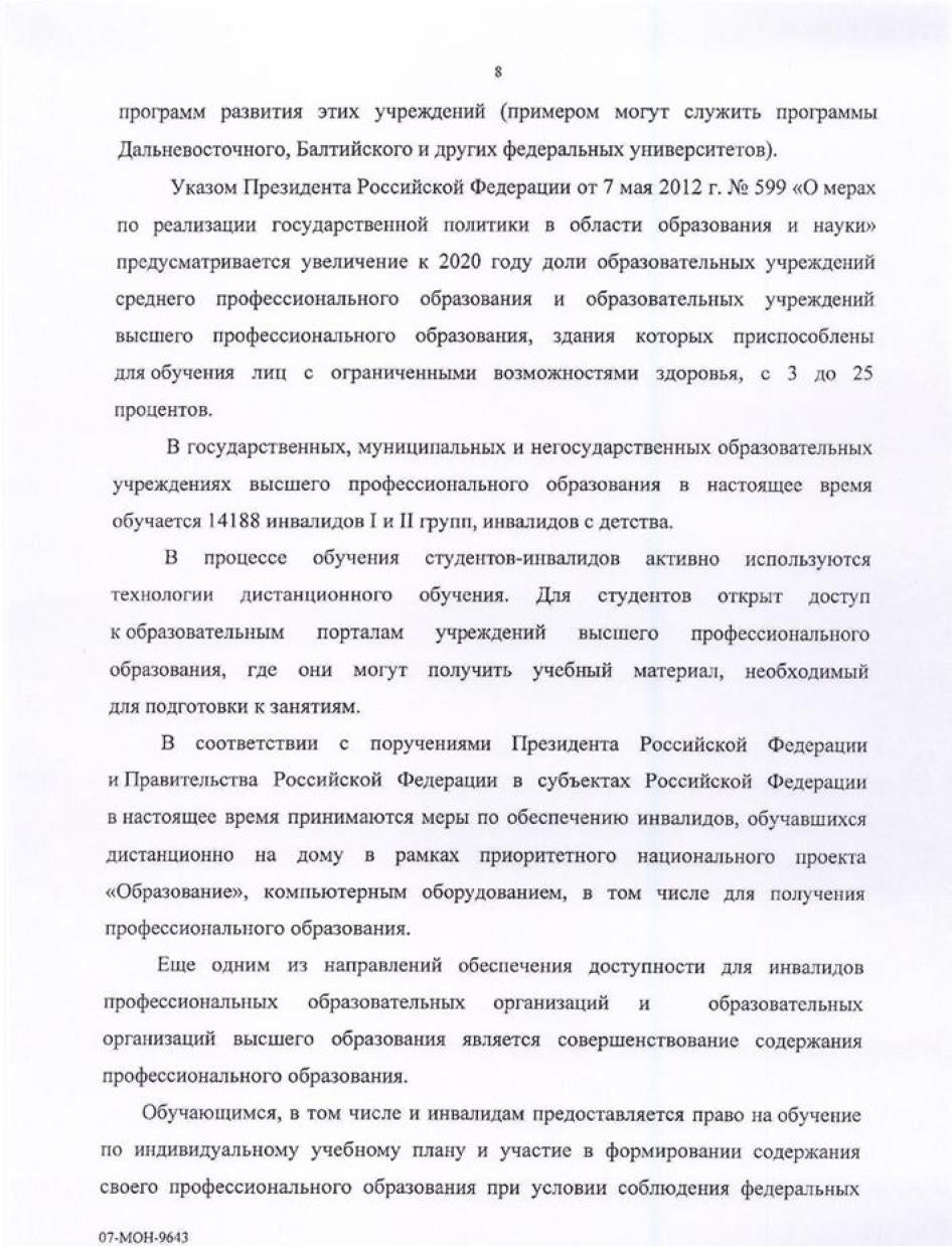 Хьюман Райтс Вотч направляла министерствам образования, культуры, здравоохранения, регионального развития, труда и социальной защиты, связи и транспорта письма с вопросами, изложением выводов доклада и предложением представить их видение ситуации, с тем, чтобы мы могли отразить его в докладе. Ответы были получены от Минкомсвязи (упоминается в тексте доклада), а также от Министерства образования и Министерства труда и социальной защиты. К сожалению, последние два поступили слишком близко к дате публикации, поэтому в самом докладе отражения не получили. Они приводятся в Приложении.