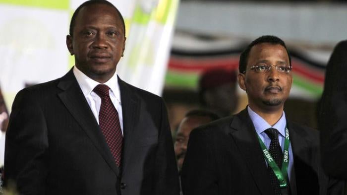 President elect Uhuru Kenyatta (L) and the Independent Electoral and Boundaries Commission (IEBC) Chairman Issack Hassan stand for the national anthem in Nairobi on March 9, 2013.
