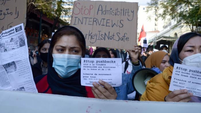 Migrants from Afghanistan hold signs that read "Stop pushbacks” during a rally against alleged pushbacks of migrants and refugees by Greek security forces at the border with Turkey, February 6, 2022.